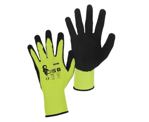 Rukavice šité z bavlny, polomáčené v přírodním latexu, s protiskluzovou úpravou v dlani a na prstech.